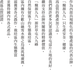 草屯鎮水稻栽種區位於九九峰自然保留區下,受合歡山融雪水沿烏溪流域而灌溉鎮內各栽培區。草屯鎮農會珍惜本鎮農業耕作的天然優勢,擁有臺灣少數自然保留區,特別成立產銷履歷集團契作專區,以契作方式保障水稻品質及農民收入。